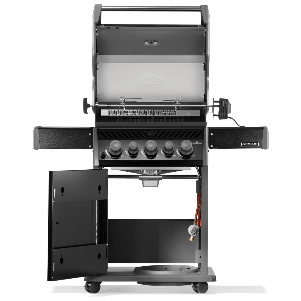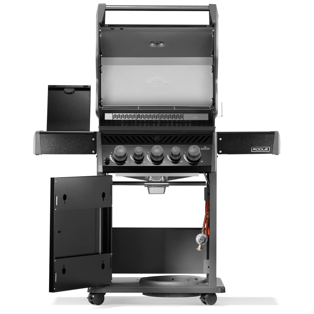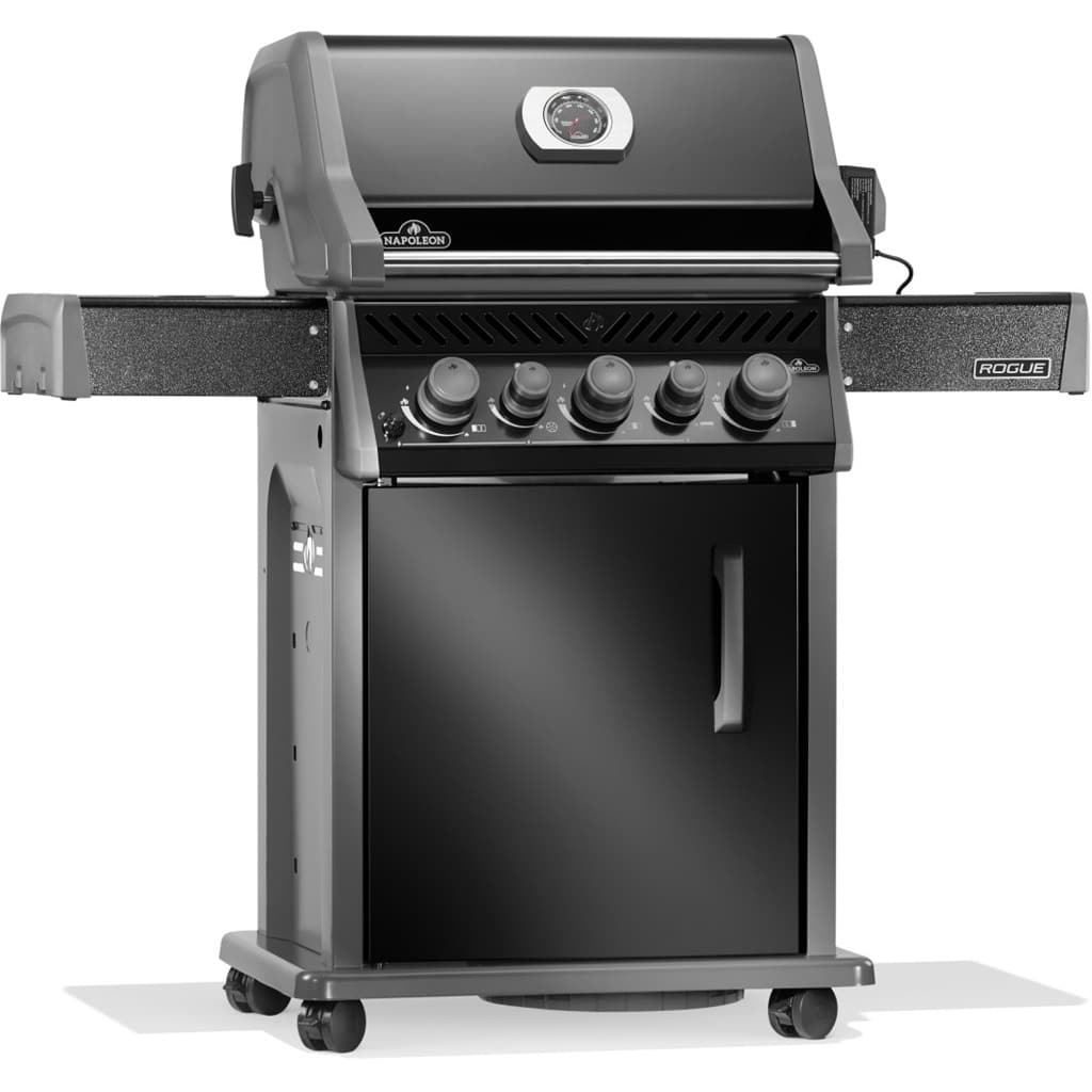 Mit dem eleganten, schwarzen Propangasgrill Rogue® 425 von Napoleon bereiten Sie saftige Grillgerichte auf unseren charakteristischen Wave-Gusseisenrosten zu. Drei Edelstahlbrenner sorgen für eine präzise Temperaturregelung, während die zweistufigen Flammschutzeinsätze die Aromen durch Verdampfen des Bratguts intensivieren. Mit einer Grillfläche von 425 Quadratzoll können Sie köstliche Gerichte für jeden Anlass zubereiten. Ausgestattet mit einem Infrarot-Drehspieß-Heckbrenner für saftige Bratengerichte und integrierten Seitenbrennern für Saucen und Beilagen, ist dieser Grill ein wahres Multitalent. Der pflegeleichte, porzellanbeschichtete Deckel und der pulverbeschichtete Korpus fügen sich nahtlos in Ihre Außenanlage ein. Mit den fixierbaren Rollen lässt sich der Grill leicht bewegen und die klappbaren Seitenablagen sparen Platz. Erleben Sie die unvergleichliche Vielseitigkeit und Qualität des Napoleon Rogue®, der dennoch erschwinglich bleibt.