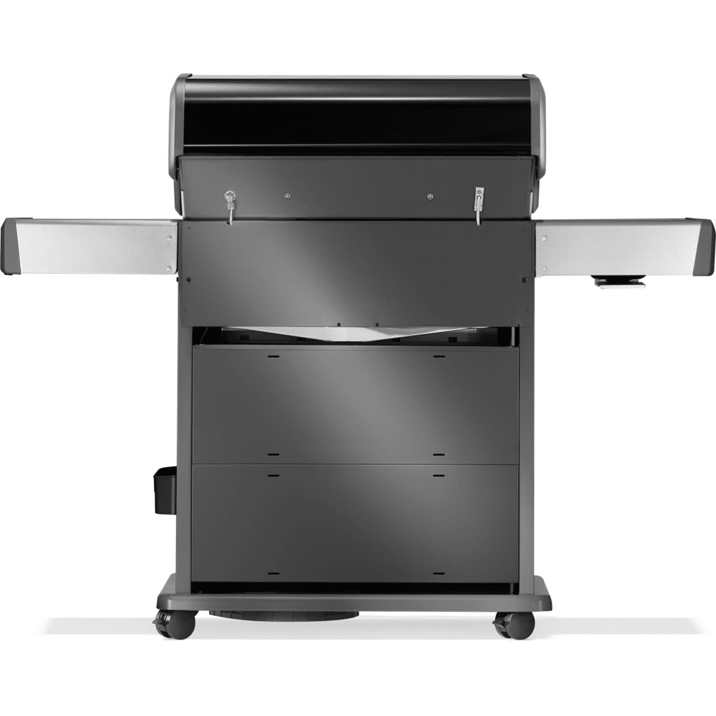 Der schwarze Propangasgrill Rogue® PRO-S 525 aus Edelstahl vereint Top-Qualität und Eleganz. Mit dem Infrarot-Drehspieß-Heckbrenner zaubern Sie saftige Bratengerichte und mit dem großen Infrarot-Seitenbrenner bereiten Sie Beilagen und Saucen in Restaurantqualität zu und braten Fleisch perfekt an. Die einmaligen WAVE™ Grillroste sorgen für eine gleichmäßige Erhitzung und verhindern ein Durchfallen der Speisen, während die zweistufigen Edelstahl-Flammschutzeinsätze Fettspritzer verdampfen lassen, so dass Ihr Grill makellos sauber bleibt. Die ergonomischen SaftyGlow™ Drehregler leuchten bei angeschaltetem Brenner rot und sorgen so für eine einfache und sichere Bedienung. Eine praktische, platzsparende, klappbare Seitenablage und leicht zu fixierende Rollen erhöhen den Komfort zusätzlich. Der Deckel und die Türen aus schwarzer Porzellanemaillierung sowie das Bedienfeld und die Seitenablagen aus Edelstahl sind pflegeleicht. Heben Sie Ihr Outdoor-Grillerlebnis mit diesem hochwertigen und eleganten Grill auf die nächste Stufe. Willkommen zur ultimativen Grillerfahrung mit dem Rogue® PRO-S Grill.